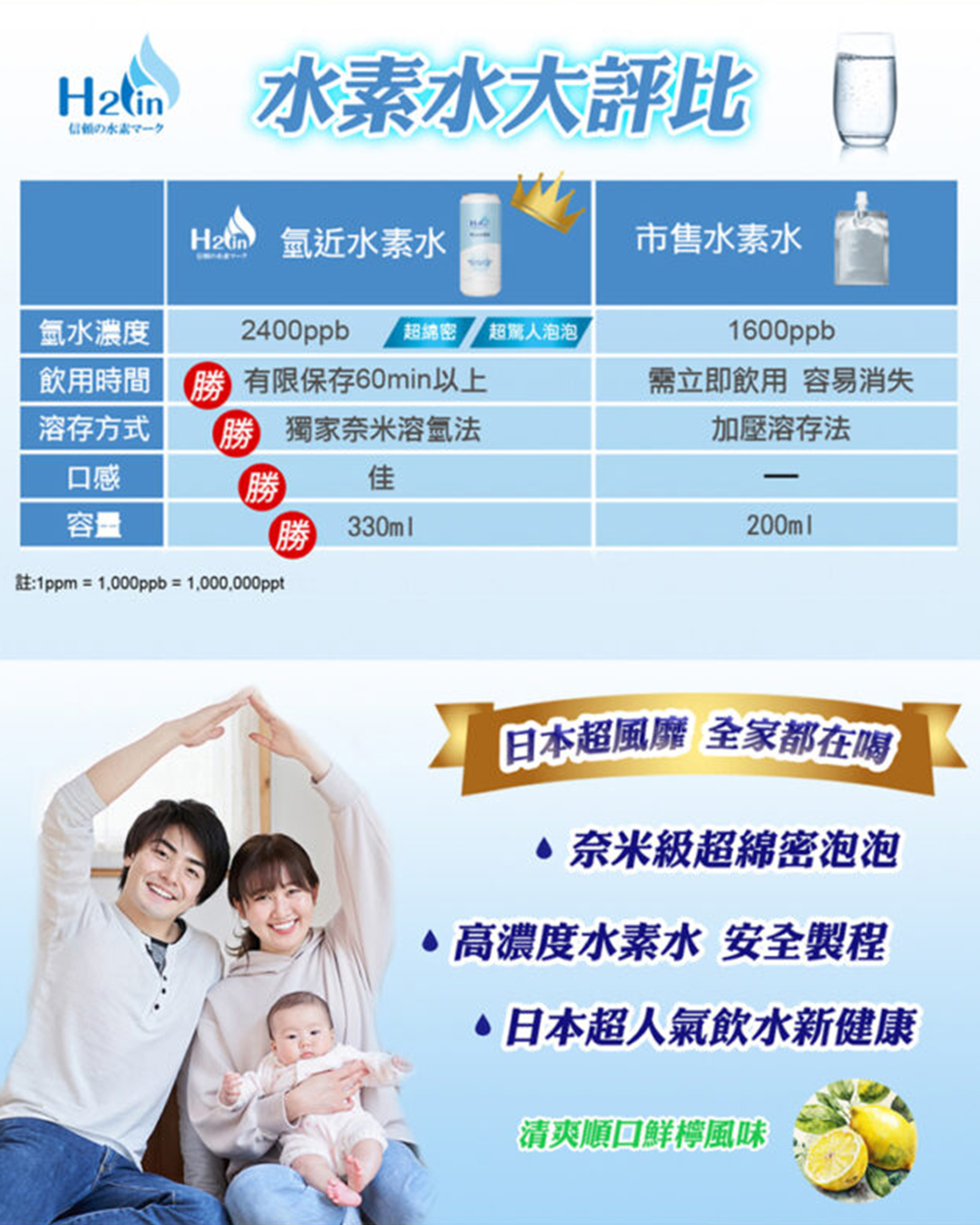 奈米溶氫:採過飽和奈米溶氫技術,效期間18個月內飲用,氫分子含量持續達2400ppb。(充填時4800ppb)